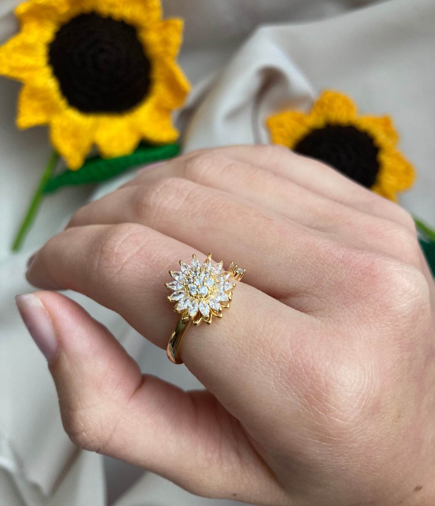 ¡Todas las mujeres aman los girasoles, ahora imagina un anillo GIRASOL GIRATORIO y bañado en oro!✨🌻